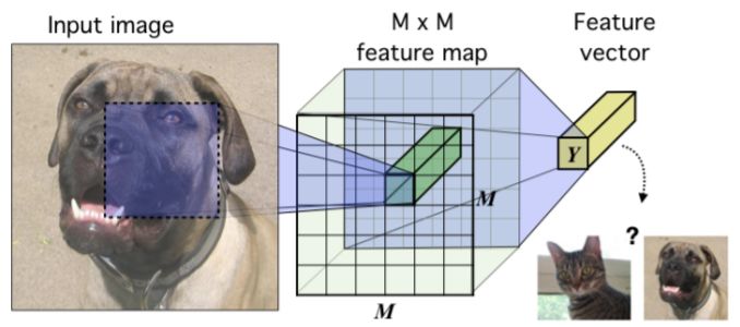 图 1:图像数据上下文中的基本编码器模型。将图像(在这种情况下)编码到卷积网络中,直到有一个 M×M 特征向量的特征图与 M×M 个输入块对应。将这些矢量(例如使用额外的卷积和全连接层)归一化到单个特征向量 Y。目标是训练此网络,以便从高级特征中提取有关输入的相关信息。