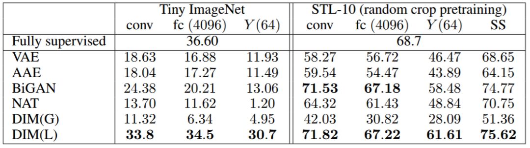 表 2:Tiny ImageNet 和 STL-10 的分类准确率(top-1)结果。对于 Tiny ImageNet,具有局部目标的 DIM 优于所有其他模型,并且接近全监督分类器的准确率,与此处使用的 AlexNet 架构类似。