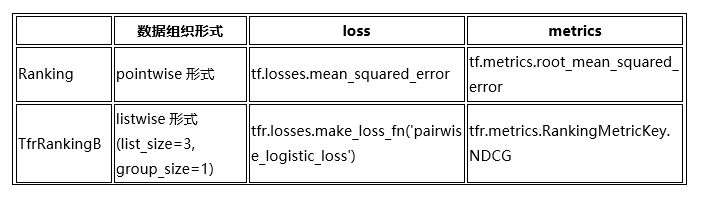 其中,TfrRankingB相比较于Ranking,模型结构完全一致,也就是采用同一个Scoring Function,训练数据集也完全一致。但是由于TfrRankingB采用TFR框架训练的LTR模型,模型优化上有以下几处不同: