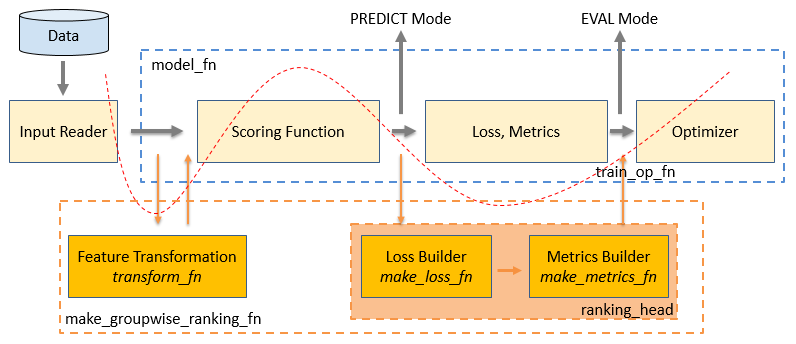 tfr.model.make_groupwise_ranking_fn来对Estimator的model_fn进行了整体的封装。我们原有的基于tf的开发,在Estimator的model_fn这个参数内需要定义包括Loss、Metrics在内的完整的模型函数,但是在tfr这里就不需要了,make_groupwise_ranking_fn会整体返回一个Estimator接收的model_fn。