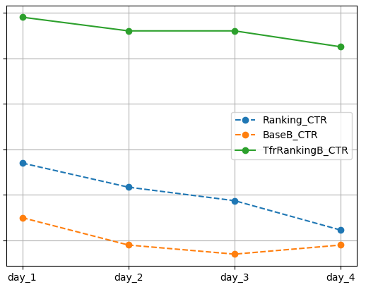 以上的几处不同是模型训练方式和评估指标上的不同,这也正是采用TFR框架带给我们的。而训练数据和模型本身,包括正则化项在内,TfrRankingB和Ranking是完全一样。两个模型训练后,与BaseB一起在线上真实流量环境下测试完整4天,其中day_1和day_2为平日,day_3和day_4是休息日。线上实验考查用户的CTR(点击率)、UCTR(用户点击率)和LPLAY(长播放占比),效果如下: