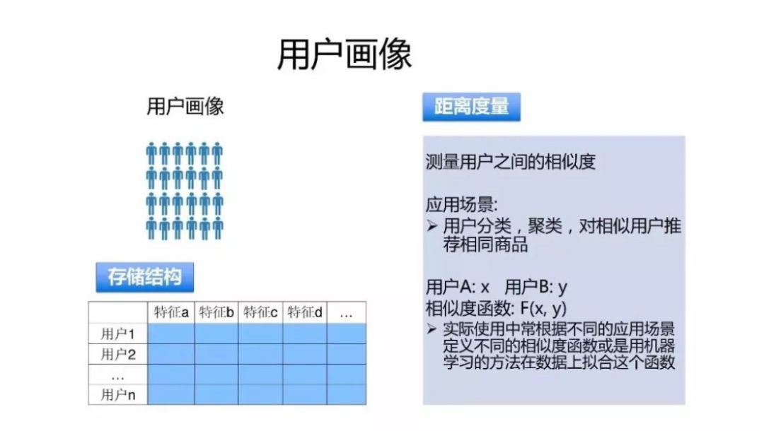比如常用的欧式距离和余弦,但实际使用中会根据不同应用场景定义相似度函数,或是在实际的数据上用机器学习的方法去拟合这个函数,有了这种对不同用户相似度度量的方法我们就可以做用户分类和聚类,或是提供对相似的用户推荐相同的商品这样的服务。