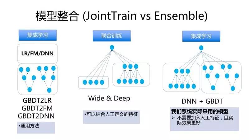 如果人工特征设计得好是可以结合两者优点取得非常好的效果的。我们系统实际使用的是上图右边这种 ensemble 的方法,因为 gbdt 是一种基于 boosting 的学习框架,那么理论上它可以 boost 任何模型,当然包括 dnn ,这样就可以将这两种模型的优点结合起来了。