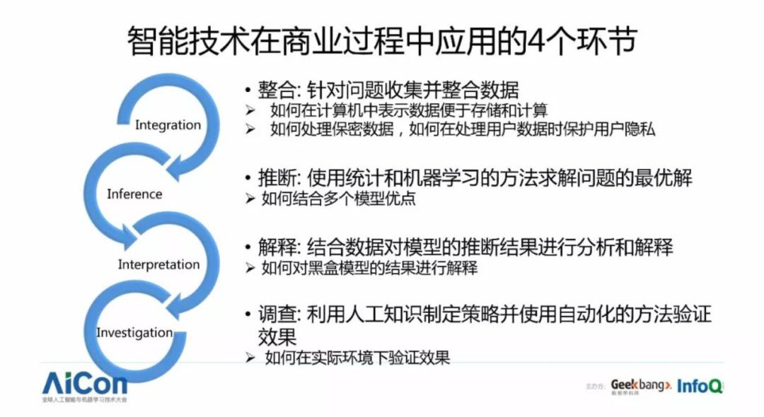 我们来看一下智能技术在商业过程中解决问题的 4 个重要环节,我这里总结了 4 个“ in ”,首先我们叫 integration ,就是针对需要解决的问题收集和整合已有的数据。