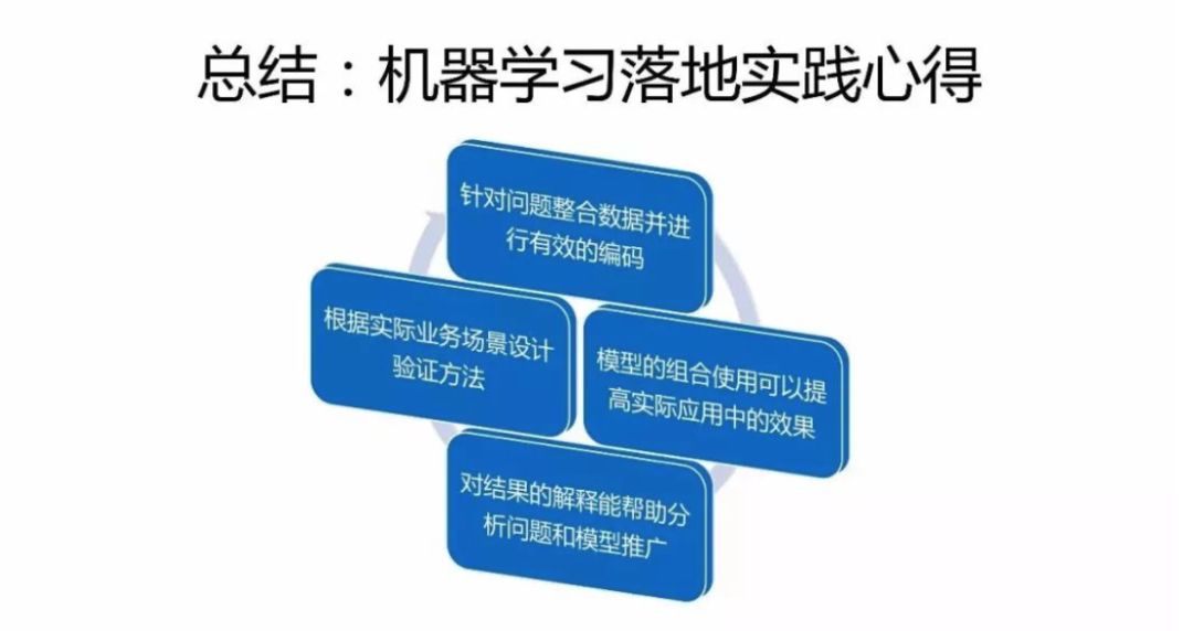 首先是我们要针对问题对数据进行整合和编码使其易于计算,数据整合后用多个模型组合使用可以取得更好的效果,对模型结果的分析和解释在模型推广时非常重要。最后,任何结论都要回到实际业务场景中验证效果。