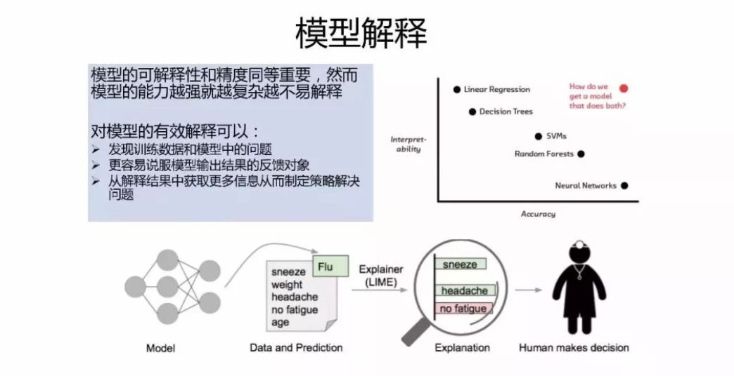 那么有没有一种方法可以同时得到比较高的精确度和可解释性呢?这其实是个鱼和熊掌的问题,因为模型的能力越强就越复杂越不容易解释,右上这个图说明了这种情况,横轴是模型的精确度,纵轴是模型的可解释性,可以看到可解释性很好的线性模型和决策树模型精度并不高,精确度很高的神经网络和深度学习解释性最差。