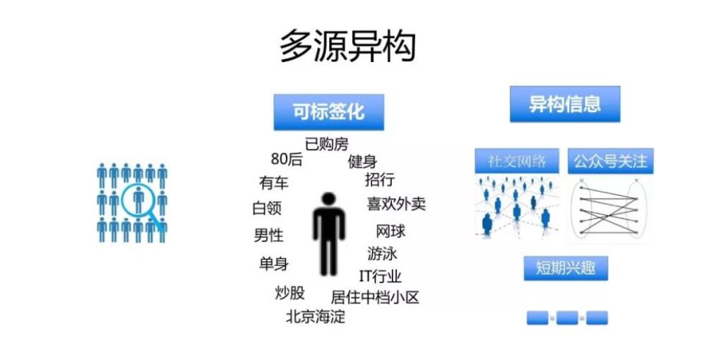 先看数据整合 integration ,这里我介绍一下实际应用中最常用到的用户画像技术,对一个企业来说最重要的资源无疑是它的用户,提供个性化和自动化的服务和产品必然需要足够的了解用户,那么用户画像就是用户在计算机中的表示形式。