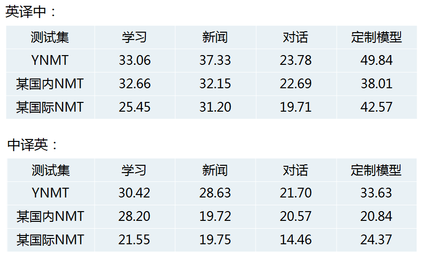 有道神经网络翻译(YNMT)BLEU值测评结果