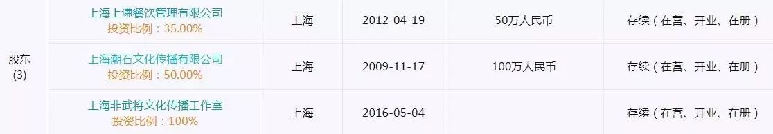 除了5家火锅店和3个服装品牌,为了经营自己的演艺事业,薛之谦还注册了上海非武将文化传播工作室和上海潮石文化传播有限公司两家公司。