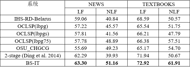 表中前5个是其他参赛系统,2-stage (Ding et al. 2014)是我们重新实现的Ding等人在2014年提出的一个两步方法[5],先用传统依存树分析器生成树结构,再用SVM分类器从规则产生的候选弧集合中选出一些弧加入其中从而得到依存图结构。BS-IT是我们的系统。实验结果表明我们的系统在两个数据集的各项评测指标中都明显超过其他系统。
