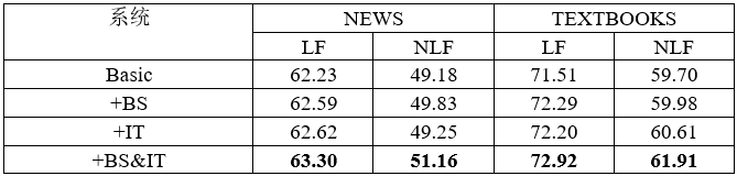 我们的系统在中英文数据集上都获得了很好的实验结果,表1是SemEval-2016 Task 9中文数据集上的实验结果。该数据集分为两部分,分别是新闻集(NEWS)和小学课本集(TEXTBOOKS),前者句子较长、较复杂,后者句子较短、较简单。该评测的评价指标中最重要的两个分别是弧标签的F值(LF)和有多父节点的词的弧标签的F值(NLF)。
