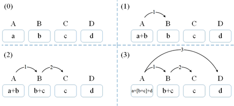由于基于转移的依存图分析的特点,我们使用的Tree-LSTM与一般的Tree-LSTM有两点不同。首先,显然该任务中需要建模的子结构不一定是树。但好在我们处理的依存图不包括环,因此仍然能够使用LSTM。更重要的是,与一般的Tree-LSTM能够同时获得一个节点的所有子节点不同,在基于转移的依存分析中,一个节点的子节点是逐个被找到的,因此我们需要不断利用Tree-LSTM更新父节点信息。具体来说,对于一个词,每当找到它的一个新子节点,就要将其所有已经找到的子节点和其本身的表示输入Tree-LSTM中计算它的新表示。例如图7中的子图构建流程如下:(1)用Tree-LSTM合并A和B的表示并将结果作为A的新表示;(2)合并B和C的表示并将结果作为B的新表示;(3)合并A、D的表示和B当前的表示(b+c)并将结果作为A的新表示。