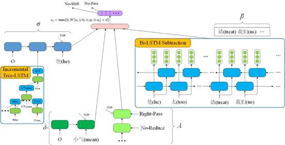 为了更好地获得转移状态的表示,我们在上述结构的基础上提出了2个有效的神经网络模块——Bi-LSTM Subtraction和Incremental Tree-LSTM,分别对转移过程中的缓存和子图进行建模。图4给出了该模型的整体结构图。