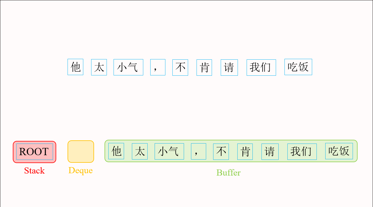 本文中,我们选择了基于转移的依存分析方法。这种方法从起始转移状态开始,不断地执行转移动作从一个状态进入另一个状态,最终达到终结状态,并将终结状态对应的树(或图)作为分析结果。转移状态包括一个保存正在处理中的词的栈(Stack),一个保存待处理词的缓存(Buffer),和一个记录已经生成的依存弧的存储器。转移动作通常包括如移进、规约并生成依存弧等。数据驱动的基于转移依存句法分析的目标是训练一个分类器。这个分类器对给定转移状态预测下一步要执行的转移动作。