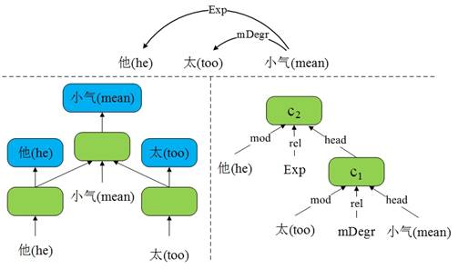 Dyer等人的模型中使用基于依存的递归神经网络(RecNN)来计算转移过程中的子结构,在处理较深的子结构时,这种方法可能会遇到梯度消失问题。为了解决该问题,我们利用Tree-LSTM[4]对这些子结构进行建模。图6显示了我们提出的Incremental Tree-LSTM与基于依存的RecNN的区别。RecNN通过递归地组合一个个父节点-子节点对来构建子图,而Tree-LSTM则能同时合并一个节点及其所有子节点。