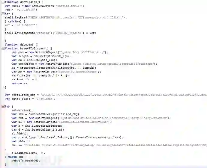loader的pdb为:E:\priv\framework\code\tools\exe2js\loader\obj\Release\loader.pdb,其功能是申请内存,解密加载执行playload:
