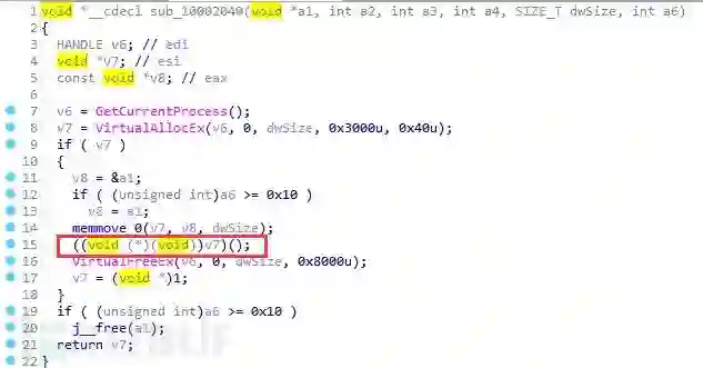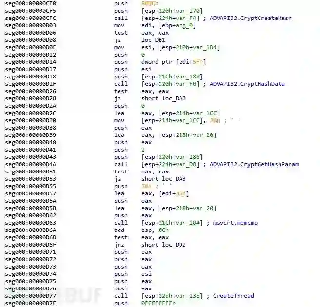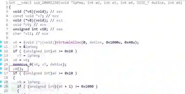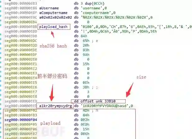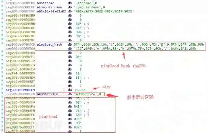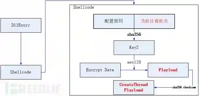 木马执行后分配内存空间,拷贝shellcode到新申请的空间中执行,shellcode的功能则是利用配置密码+本地计算机名的hash作为密钥解密最终的playload,并对playload进行校验,成功后创建新线程执行playload。