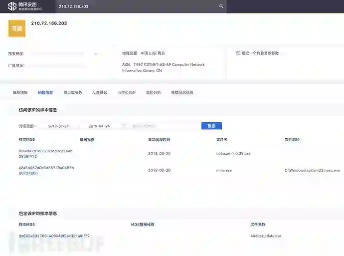 此外,在上段所述的加密的前缀中,我们还发现了一个ip:210.72.156.203做为加密前缀,我们从腾讯安图查询可见: