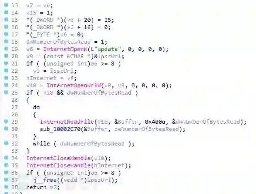 chrome_elf.dll功能除了实现调用原始默认程序打开txt、doc文件外,还会连接网络下载下一阶段的恶意文件并在内存中直接执行: