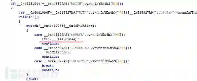 通过一系列解密后最终通过eval执行解密后的脚本: