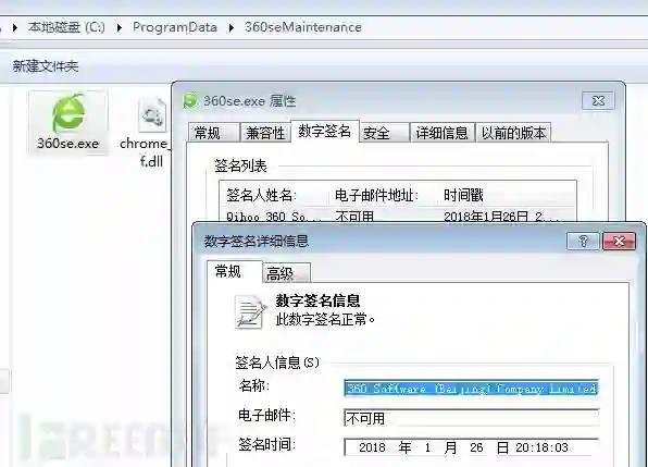 然后再次使用白加黑的技术,使用360se的主程序做为白文件,加载恶意的chrome_elf.dll: