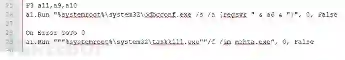 接着调用系统自带的odbcconf.exe,将7b95ffab-3a9c-494a-a584-9c48dc7aa6a7.tmp(dll文件)给加载起来。最后调用taskkill.exe,结束mshta.exe进程: