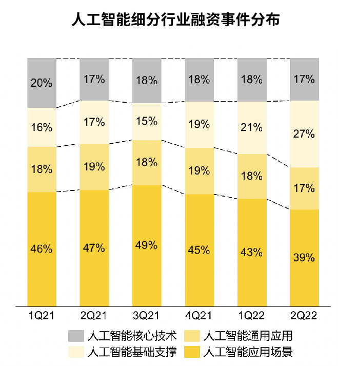 ,人工智能应用场景落地项目为投融资热门方向。2022 年上半年国内人工智能细分行业融资事件分布以应用场景为主。其中自动驾驶以及智能医疗作为其中的主要场景受到资本市场的广泛重视,累计贡献应用场景中近 40% 的融资事件。芯片半导体等硬件为代表的人工智能基础支撑方向获得资本市场的青睐,相关事件的占比从去年至今不断提高,截止到 2022 年第二季度贡献当季 27% 的投融资事件。