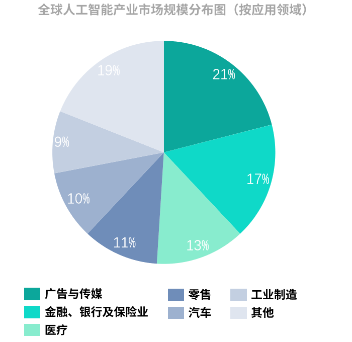 。受益于信息流广告及内容推荐算法在互联网行业的快速崛起,广告及传媒领域应用占市场规模的 219%,是目前 A 市场化应用规模最大的行业;金融保险(17%)、医疗(13%)、零售(11%)也是人工智能应用较为成熟的行业。同时,伴随着自动驾驶及智慧制造解决方案的快速发展,汽车(10%)及工业制造(9%)也成为发展最快的 AI 应用领域。