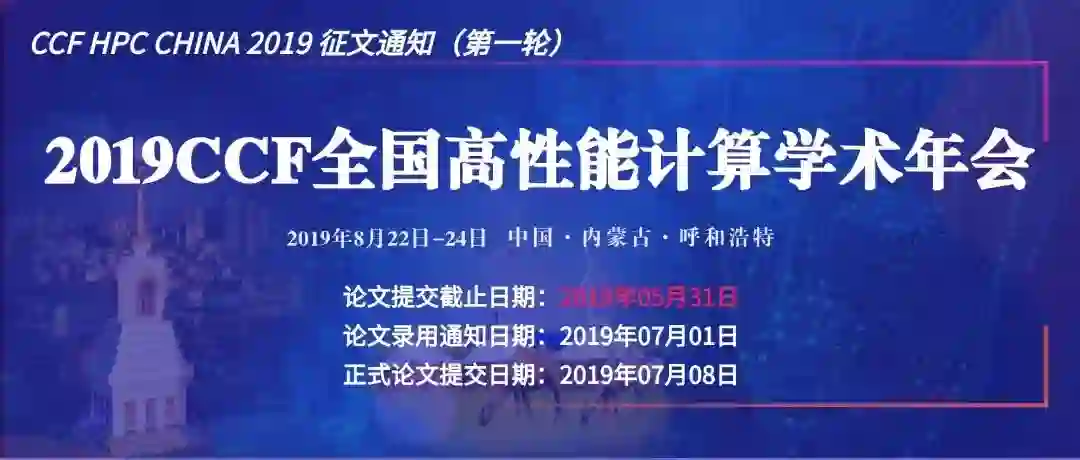 CCF HPC CHINA 2019将于2019年8月22日至24日在内蒙古呼和浩特召开。论文提交截止日期:2019年05月31日