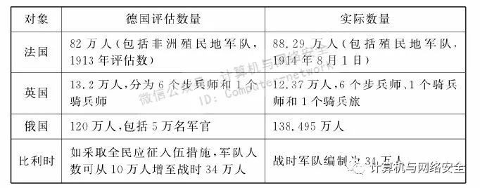 战前,德国重点对对象国的兵力数量进行了评估,在积极搜集情报、综合分析对象国可能采取的措施、扩军政策、社会状况的基础上,对潜在对手的兵力有了准确的认识。从下表可看出,德国对兵力的评估工作相当出色。