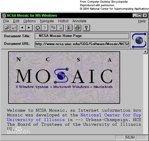 1993年初,世界上第一个可以显示图片的浏览器Mosaic-Alpha版(运行于Unix平台)发布,9月份Mosaic-1.0版(运行于Apple Macintosh、Microsoft Windows平台)发布。Mosaic的界面简洁,网页展示区域很宽,为Web的超文本语言增添了全新的特点,不但可以显示图像,还能循环展示GIF动图,用户不用特别掌握电脑方面的专业知识,也不用经过任何特殊训练,用小小的鼠标就可以方便地浏览Web网的内容。原来仅在技术专家之间进行的网络通信一下变成了寻常百姓都能理解的有趣事情。