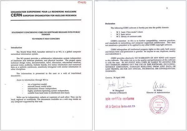 伯纳斯-李在他撰写的“编织万维网(Weaving the Web)”一书中描述:“1993年CERN一位所长签发了一个声明,并盖了CERN的印章。声明说CERN允许任何人可以无偿地使用因特网的协议及其代码,用以建造服务器或浏览器,提供别人使用或出售,没有任何版权或其他限制。”伯纳斯-李为此非常高兴!