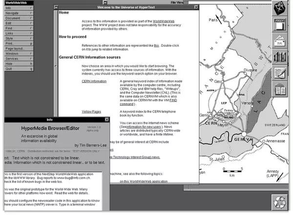 伯纳斯-李电脑上CERN浏览器的网页截图(1990年)(图片来自http://info.cern.ch/NextBrowser.html)