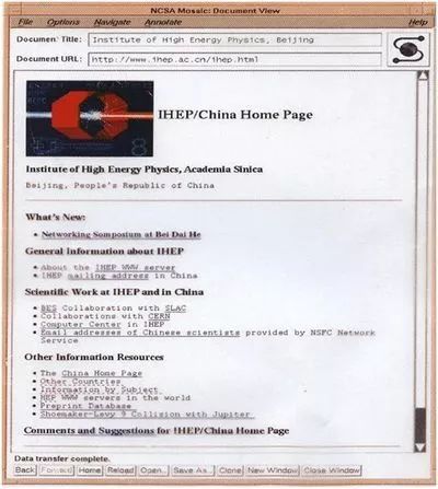 1994年5月15日,高能所率先引入Web技术搭建了中国的第一台Web服务器,并推出第一个网站www.ihep.ac.cn和英文网页(那时,亚洲都没几个网站出现),介绍高能所的科研活动、中国的高科技发展,并引入国际上重要的相关网站。网站上还设有“Tour in China”栏目,提供新闻、经济、文化、商贸等更为广泛的图文并茂的信息。