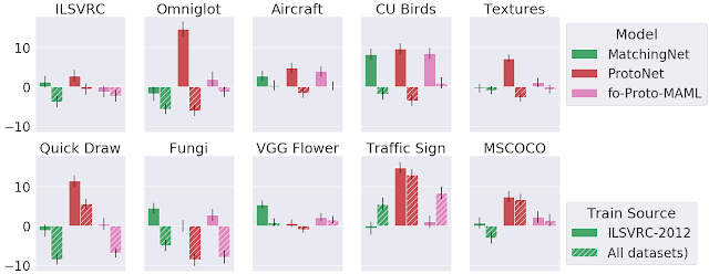 在 Meta-Dataset 中,除了上述小样本学习中固有的难以泛化至新类的问题,我们还研究了训练成果至全新的数据集的泛化(训练中未使用任何类的图像)。