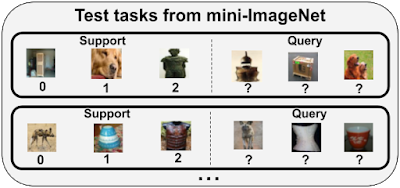 采用 mini-ImageNet 执行的测试任务:每个任务为先前未曾遇到(测试)的类之间的分类问题。模型可使用新类的一些带标签样本组成的支持集适应手头的新任务,然后预测这些新类的查询样本标记。评估指标为查询集准确度,根据每个任务中的样本和各任务之间的结果取平均值