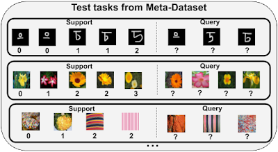 Meta-Dataset 的测试任务:与上文展示的 mini-ImageNet 任务相反,此处的各种任务来自不同的数据集(的测试类)。此外,各任务之间的类数量和支持集大小可能不同,支持集中可能存在类不均衡的问题