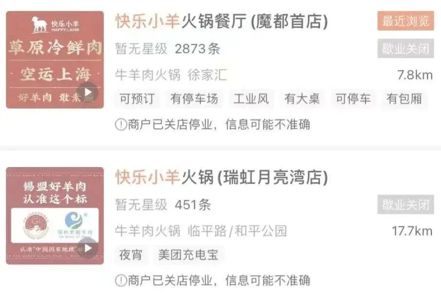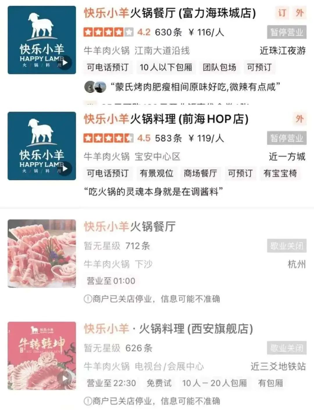 据大众点评显示,截至目前,快乐小羊在内地有50余家门店,分布在36个城市中,被关闭的门店大多位于一线、新一线城市,而下沉市场的门店则大多在正常运营。