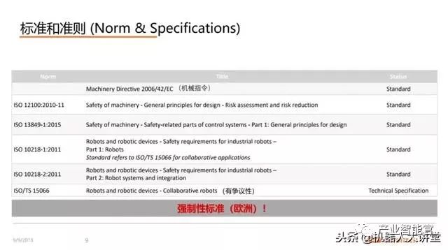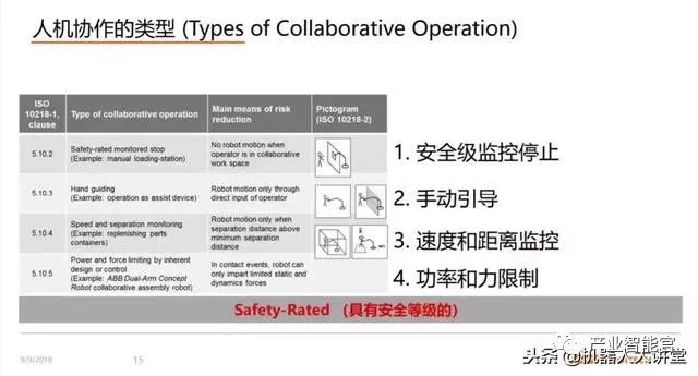 以上改进措施通过ISO 15066(Robots and robotic devices — Collaborative robots)进行规范。目前这一协议还在TS阶段,尚未成为ISO标准。