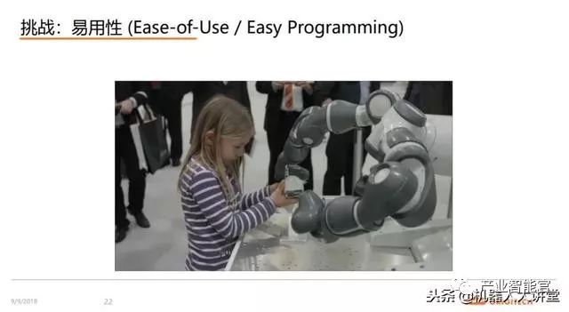 第六个挑战:易用性。如果一个机器人可以让一个小女孩快速上手操作,那么它的使用市场将会变得越来越大。无论是基于图形化编程的方式、基于命令行编程的方式,还是基于电流环的互动或是基于力的互动,只要把机器人的使用门槛降低,就会容易找到。这也是在市场角度客户的痛点,把机器人的使用门槛降低其实具有非常大的市场,丁昊博士说。