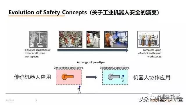 关于工业机器人安全的演变,丁昊博士提到,协作或者说协同操作在国际标准里有一个非常明确的定义。而协作其实是应用。协作不仅仅只是针对机器人的本体,研究人员还需要考虑到机器人的传感器、夹具等。在做人机协作和风险评估的时候不仅要考虑到本体的问题,还要考虑其他一些问题比如:人的位置、人机是碰触式的还是传感器能够感知人的位置、或是用力、机器人本身是否有锋利的夹具可能对人造成伤害。而触碰又包括碰触到人的身体、上半身、下半身。所以,协作的定义是应用,而不仅仅是本体本身。