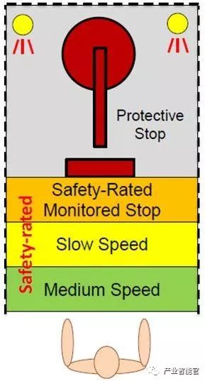 为了确保安全, ISO10218规范出台, 提供了一系列指导意见和建议. 工程师通过视觉,激光等手段监控人类行为,根据安全区域划分, 确定保护行为,如机器人自动降速, 降功率, 关闭使能等操作. 一旦人类进入伤害区域, 机器人必须完全停止.