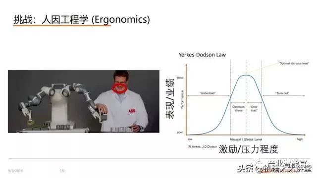 第三个挑战:人因工程学。下图左边是Yumi的原型机,它旁边的操作人员面带笑容。右图中是很早之前的研究,为的是使工厂里有压力的工人表现得更好。丁昊博士说,虽然工厂中是全自动化的产线,但如果工人对工作是热爱的,那么这个产线的产能会比指示类的工作产能更好。所以,人因工程学是在做人机协作/协同的时候,必须考虑的因素。