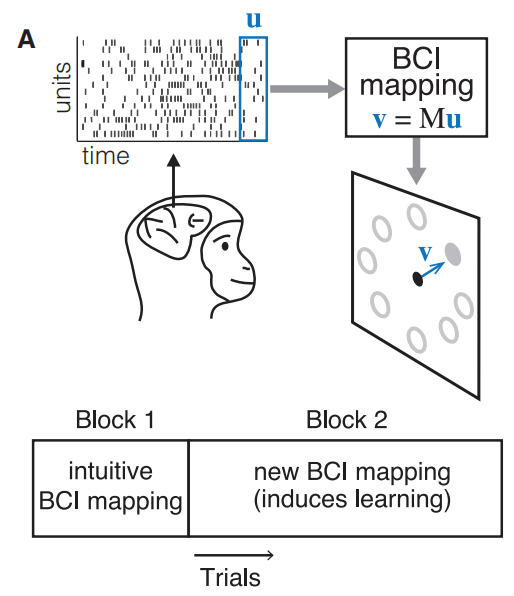猴子通过调节初级运动皮层中记录的 90 个神经元的尖峰活动,将计算机光标引导到八个视觉目标之一。神经活动与光标速度之间的关系由 BCI 映射定义。当引入新的 BCI 映射时,受试者必须学会修改他们的神经活动以提高性能(即,将光标引导到目标)。