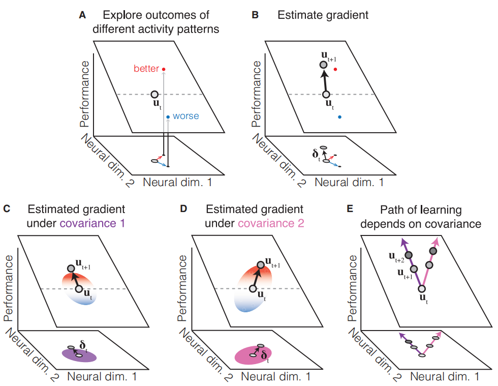 大脑可以在多大程度上控制学习过程中的神经变异?当然,如果行为层面存在可变性,那么它也将存在于驱动该行为的大脑区域中。但令人惊讶的是,神经群体活动中存在的大量可变性似乎在学习过程中并未发生改变。多条证据表明,即使在限制性能的情况下,在数天或数周的实践过程中,群体协变的结构仍然有些不灵活。正如将在下面解释的那样,这种不灵活是学习环境中的一个重要考虑因素。