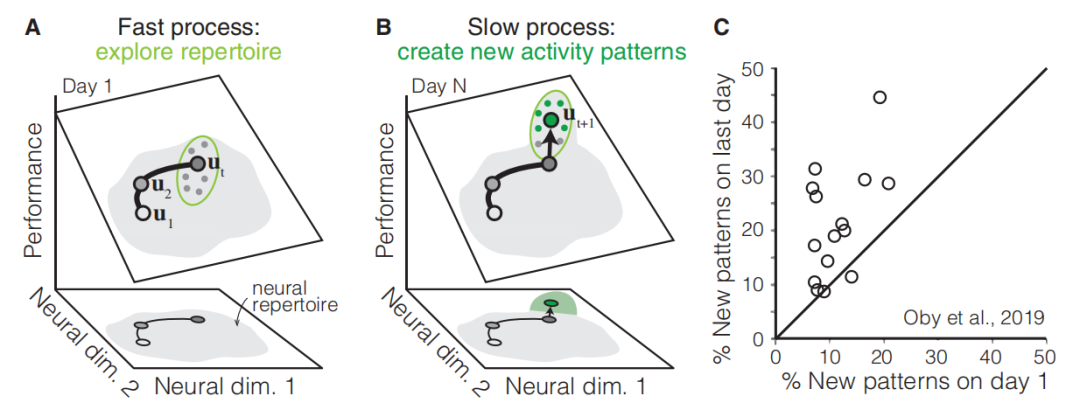 在学习过程中,神经活动会发生变化以改善行为。理解这一过程的一种常见方法是:表征神经活动在学习经历期间或之后,在哪些方面发生变化或不发生变化。这种方法可以提供关于大脑不同部分如何有助于提高任务绩效的线索。