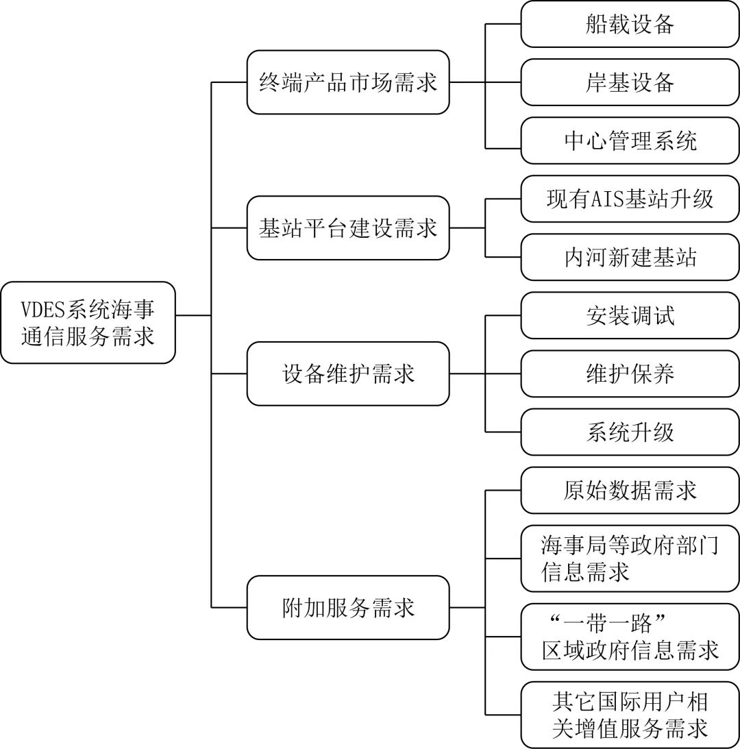 对AIS系统的目标客户需求进行调研发现,VDES系统商业海事通信服务需求主要包括终端产品市场需求、基站平台建设需求、设备维护需求、附加服务需求4类(见图 1)。当前,安装A类AIS系统的船舶数量约为2万艘,按照5年更新一次设备的假设,截至2030年,终端产品的市场需求容量约为16亿元;现有AIS基站升级需求空间约为4亿元,内河新建基站平台需求约为10亿元;设备维护需求空间约为5亿元;附加服务约为5亿元。预计到2030年,VDES 产品与服务市场累计容量约为40亿元。