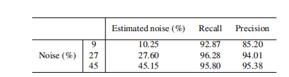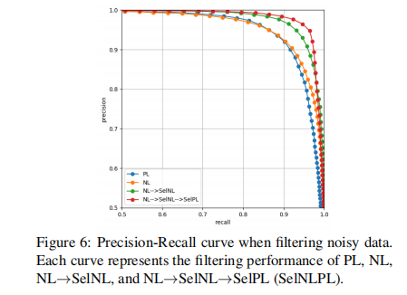 的数据认为是干净的。按照这种方法,我们将未经PL训练的数据看做是噪声数据。Table1总结了具有各种噪声比值的CIFAR10上的SelNLPL滤波结果。其中Estimated noise表示未经PL训练的数据中的噪声比。召回率和精度是衡量噪声数据过滤质量的方法。结果标签,估计的噪声比几乎和实际噪声匹配度在88%到99%之间。此外,Table1展示我们过滤噪声数据的方法可以产生较高的召回率和精度值,这代表我们的方法从训练数据中滤除了大多数纯噪声数据。这意味即使未知混入训练数据的噪声量(在实际情况中是正常现象),也可以使用SelNLPL估算噪声量,这是一个巨大的优势,因为它可以用作训练数据标注质量的判断标准。Figure6比较了我们的方法的总体过滤能力。PL曲线是在过度拟合噪声数据之前用PL训练的模型测试获得的。曲线表明,SelNLPL的每个步骤都有助于提高过滤性能。