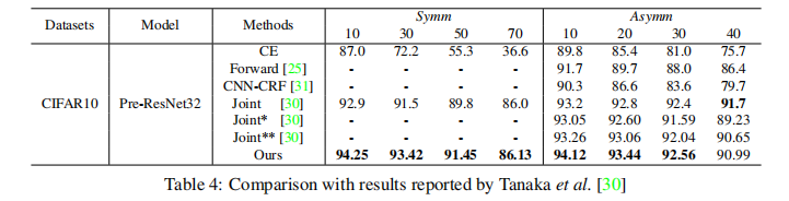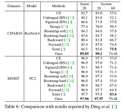 在本节中,我们将介绍为评估我们的方法而进行的实验。将SelNLPL之后的伪标记结果与用于噪声数据分类的其他现有方法的结果进行比较。为了证明我们的方法可以推广到各种环境,我们遵循其他的baseline方法的实验设置,这些实验在CNN架构,噪声数据集类型等存在不同,具体的实验测试结果如Table3,4,5,6所示。