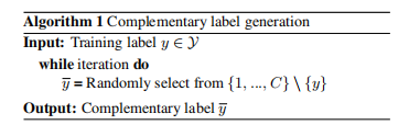 该互补标签是完全随机的,因为它是针对训练期间的每次迭代从除给定标签y之外的所有类别标签中随机选择的,如Algorithm1所示。等式(2)使补充标签的概率最优化为0,从而导致其他其他类别的概率值增加,从满足NL的要求。
